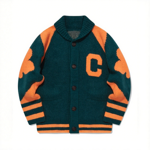كارديجان مدرسي مخصص بشعار OEM للرجال، سترة صوفية محبوكة بتصميم فارسيتي مع حروف