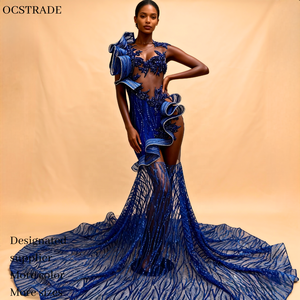 فستان سهرة فاخر من أوكستريد بتصميم شفاف مزين بالترتر والكشكشة، فستان حفلات أنيق باللون الأزرق الملكي مرصع بالأحجار الكريمة
